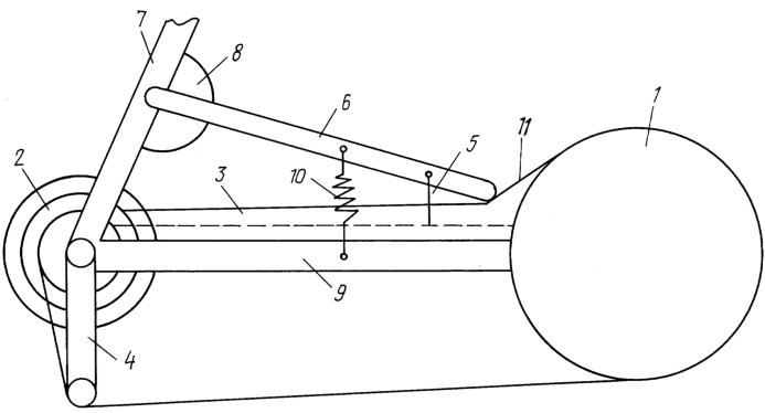 При вращении педалями ведущей звездочки 1 происходит натяжение цепи 11, которая отжимает вверх свободный конец рычага 6 прижатый пружиной 10 к горизонтальной стойке 9 рамы велосипеда.