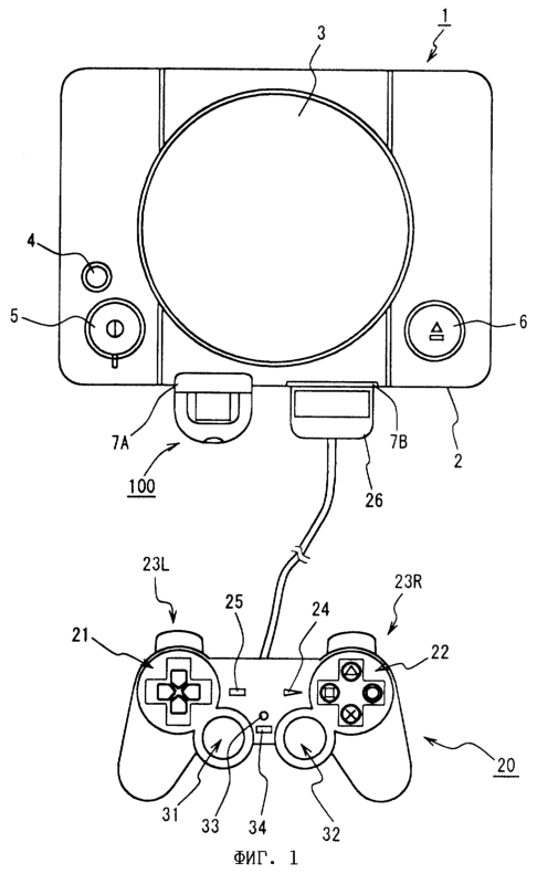 Устройство 1 для развлечений имеет основной блок 2, в центральной части которого расположен дисковод 3 для оптического диска, такого как компакт-диск либо другой аналогичный носитель информации или носитель записи, на котором записана прикладная программа видеоигры, переключатель 4 сброса, предназначенный для произвольного возврата игры к ее началу, выключатель 5 электропитания, кнопка 6, которая используется для установки в дисковод и извлечения из него оптического диска, и два гнезда 7А и 7В.