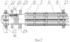 В пружине 11 есть два гладких, а под ними в деталях 9 два резьбовых отверстия. Из необходимого количества – девяти – секций 6, двух гибких полос 19, в которых просверлены отверстия с шагом, задаваемым количеством элементов, и винтов 20 на основной цилиндрической оправке 3, установленной с возможностью вращения и имеющей защитный слой 25, предотвращающий приклеивание проводников оболочки к оправке при дальнейшей заливке, собирается “полотно” проводников (см. фиг.3 и 4), облегающее оправку 3. Концы секций прижимаются к основной оправке 3 разрезными хомутами 21. Затем оправка 3 с секциями 6 устанавливается на токарный или намоточный станок (см. фиг.5 и 6), удаляют полосы 19, сдвигают в сторону вдоль паза пружины 11, на освободившемся от пружин 11 участке раскрепляют и удаляют скобы 7 и детали 9 приспособления, в результате чего на этом участке освобождаются проводники секций оболочки. По краям освобожденного участка устанавливают хомуты 22 и 23, с их помощью проводники разравнивают и прижимают к оправке. У хомута 22 закрепляют капроновую нить 24, включают вращение оправки и обматывают проводники нитью. По мере приближения нити к хомуту 23 его отодвигают, отодвигают также пружины 11, последовательно рассоединяют и удаляют скобы 7, детали 10, 9, 8, обматывая освобождающиеся участки оболочки нитью вплоть до края оболочки, где удаляются также хомуты 21 и 23. Конец нити закрепляют. Затем возвращаются к началу обмотки нитью, снова закрепляют конец новой нити, удаляют оставшиеся детали 8 и хомут 21 и обматывают освобожденный участок оболочки нитью с закреплением ее конца.
