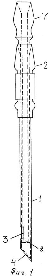 Мандрен 6 через канюлю 2 вводят в просвет 5 корпуса иглы 1 до соприкосновения канюли 2 с канюлей мандрена 7. Диаметр мандрена 6 подобран таким образом, что он свободно входит в просвет 5 корпуса иглы 1, полностью перекрывая боковое отверстие 3.