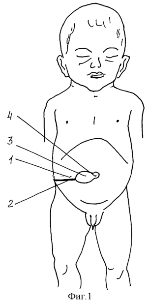 Брюшную полость 1 вскрывают разрезом 2 брюшной стенки вправо от наружного угла дефекта 3 по линии расслабления кожи. Длину разреза 2 делают такой, чтобы произвести репозицию органов в брюшную полость 1. В левую половину брюшной полости 1 и укладывают толстый кишечник, а в правую – тонкий. После чего ушивают разрез 2 и дефект 3 от наружного угла разреза 2 в сторону пуповины 4, что дает возможность соединить одноименные анатомические образования и замкнуть пупочное кольцо. Проходную ткань в области дефекта 3 иссекают и мобилизуют кожу от мышц. Брюшную стенку ушивают в два слоя: первый – брюшина – мышца, второй – кожа с подкожной клетчаткой. Пуповину и обрабатывают хирургически или акушерски.