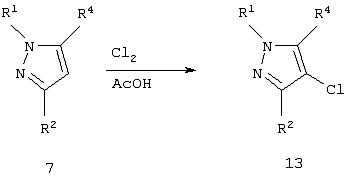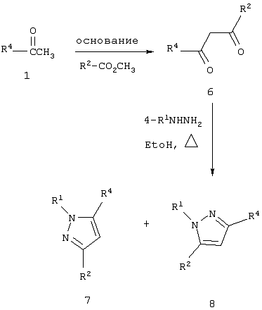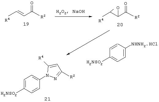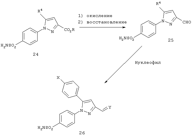 Использование стирилпиразоловых сложных эфиров для противодиабетических лекарственных средств описано [Н. Mokhtar, Pharmazie, 33, 649-651 (1978)]. Использование стирилпиразолкарбоновых кислот для противодиабетических лекарственных средств описано [R.Soliman et al., Pharmazie, 33, 184-5 (1978)]. Описано использование 4-[3,4,5-тризамещенный пиразол-1-ил]бензолсульфонамидов в качестве полупродуктов для противодиабетических средств на основе сульфонилмочевины, и в частности, 1-[4-(аминосульфонил)фенил]-3-метил-5-фенил-1H-пиразол-4-дикарбоновая кислота [R. Soliman et al., J. Pharm. Sci., 72, 1004 (1983)]. Был получен ряд 4-[3-замещенный метил-5-фенил-1Н-пиразол-1-ил]бензолсульфонамидов в качестве полупродуктов для противодиабетических средств, и более конкретно 4-[3-метил-5-фенил-1Н-пиразол-1-ил]бензолсульфонамид [Feid-Allah., H., Pharmazie, 36, 754 (1981)]. Кроме того, 1-(4-[аминосульфонил]фенил-5-фенилпиразол-3-карбоновая кислота была получена из описанного выше 4-[3-метил-5-фенил-1Н-пиразол-1-ил]бензолсульфонамидного соединения [R.Soliman et al., J. Pharm. Sci., 70, 602 (1981)].