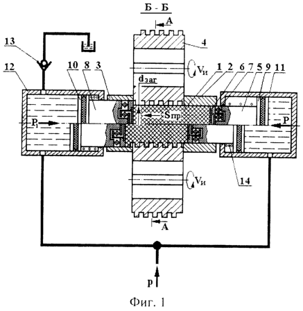 Заготовка 1 имеет возможность свободно вращаться вокруг собственной оси за счет сил трения благодаря вращению роликов 4. На правый торец заготовки 1, согласно фиг.1, осуществляется воздействие пуансоном 5 с силой Р через подпятник 6 и упорный подшипник 7. Для того чтобы компенсировать осевую силу Р, левый торец поджимается плавающим упором 8 с силой P1=P, также через подпятник и упорный подшипник. Пуансон 5 и плавающий упор 8 являются штоками поршней 9 и 10 гидроцилиндров 11 и 12 соответственно.