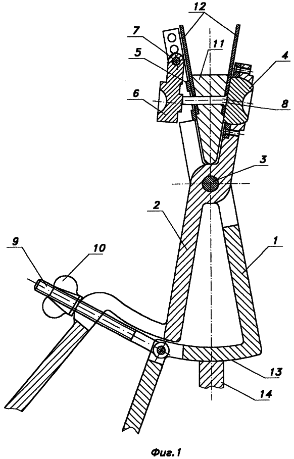 В отверстие клиновидного пакета, состоящего из клиновидного сухаря 11 и прилегающих к нему обшивок 12, вставляют заклепку 8. Причем ось отверстия под заклепку перпендикулярна оси симметрии пакета, а оси гнезд под закладную головку и замыкающую головку перпендикулярны наружной поверхности пакета. Прижимная шайба 5 устанавливается на склепываемый пакет опорной поверхностью, при этом выступающая часть заклепки выставляется по центру выреза под обжимку 6. При этом поверхность 13 ручки упирается в деталь стапеля 14. При сжатии ручек устройства поддержка 4 прижимает закладную головку заклепки, происходит самоустановка поддержки по поверхности пакета. Сжатие ручек устройства также обеспечивает предварительное сжатие пакета между опорной поверхностью прижимной шайбы 5 и поверхностью поддержки 4, болт 9 и гайка 10 фиксируют усилие сжатия.
