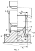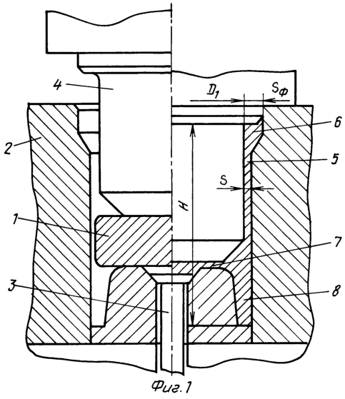 Изготавливалось спортивное колесо размером 13″×19″ из сплава системы магний-литий. Исходная заготовка 1 размерами 500 мм × 110 мм, массой 40 кг нагревалась и укладывалась в полость штампа 2 с выталкивателем 3 и пуансоном 4. Прикладывалось деформирующее усилие и образовывали промежуточный полуфабрикат в виде чаши высотой H=400 мм, внутренним диаметром D1=465 мм. Воздействием осевого усилия на открытый торец стенки 5 чаши формируется фланец 6 толщиной S=25 мм, сохраняя диаметр D1 постоянным. При этом на внешнем торце дна 7 образовывали кольцевой выступ 8.