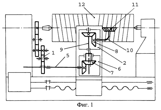 Устройство работает следующим образом. Заготовка 12, на которой необходимо обработать винтовую поверхность, закрепляется в зажимном приспособлении, установленном на шпинделе станка, и поджимается пинолью задней бабки. Исходя из характеристики винтовой поверхности обрабатываемой детали, числа режущих элементов инструмента и выбранной продольной подачи, определяется передаточное отношение зубчатых колес гитары по формуле