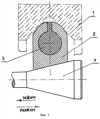 Деталь 1 (фиг.1 и 2) внутренними перевернутой V-образной или прямой М-образной выточками ориентируются на кулачок 2; четыре кулачка 2, изготовленных из пружинной стали в одном комплекте, размещаются в гнездах прямоугольного сечения корпуса патрона и прижимаются к конической поверхности штока 3, перемещаемого вдоль оси, четырьмя рессорными пружинами (условно не показаны); перемещение штока 3 осуществляется от пневматического или гидравлического привода.