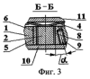 Регулирование зазоров осуществляется с помощью винта 9, ввернутого в резьбовое отверстие, ось которого проходит по плоскости касания клиновидной пластины 8 с корпусом 1 под углом к оси вращения и половина просверлена в пластине 8, а другая половина – в корпусе 1, при этом резьба нарезана только в корпусной половине отверстия. Половина просверленного отверстия в пластине 8 является глухим, резьбовая половина отверстия в корпусе 1 является сквозным. При регулировке винт 9 упирается в торец глухого отверстия пластины 8 и заставляет перемещаться ее в продольном направлении.