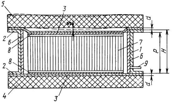 При зазоре более kd, т.е. при Н>Р+kd, резко увеличивается вероятность коробления мембраны контейнера и вызываемых этим короблений и деформаций конструкции.
