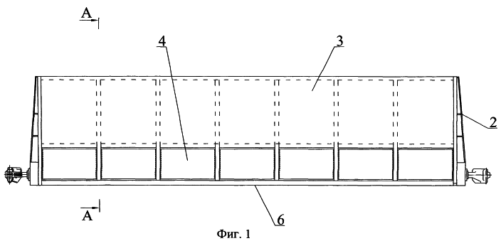 На фиг.2 представлено поперечное сечение кузова (по поперечным балкам) А-А фиг.1 с разгрузочными люками, открывающимися вверх.