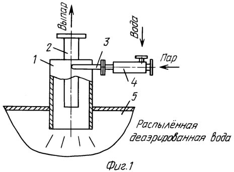 В силу конструктивных особенностей паровое сопло 6 и камера смешения со смесительным конусом 7, их взаимного расположения, в камере смешения создается в процессе исчезновения паровой фазы вакуум, который способствует при нагреве деаэрируемой воды до температур, близких к насыщению, выделению растворенных в воде газов (O2, СО2 и др.) с образованием пузырьков газа.