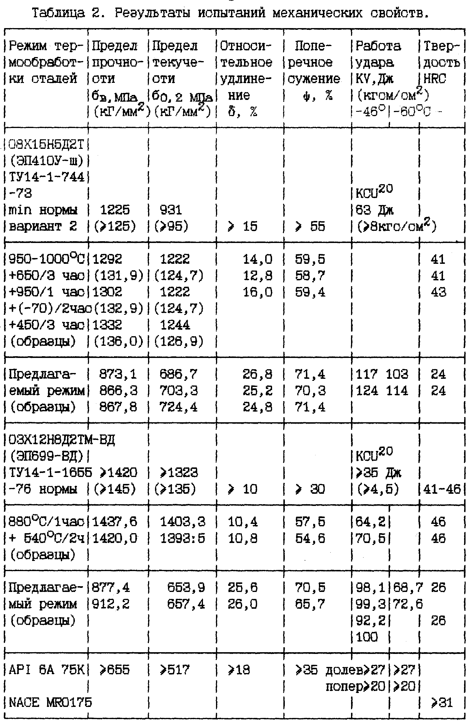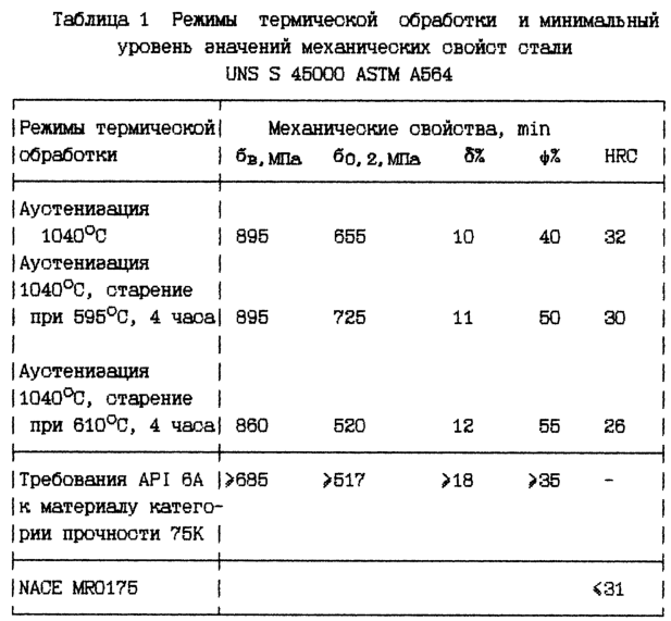 Изобретение относится к металлургии, в частности к термической обработке мартенситных дисперсионно-твердеющих сталей. Техническим результатом является повышение стойкости к сероводородному растрескиванию деталей, работающих в кислых средах под нагрузкой не ниже 0,8 от 517 МПа в климатических условиях Севера, повышение уровння пластических характеристик, работы удара при отрицательных температурах. Это достигается тем, что при термической обработке мартенситных дисперсионно-твердеющих сталей проводится закалка с температуры 900-1000°С в течение 1 часа и дважды двойное старение в интервале температур 650°С и не выше 675°С±20°С и при температуре 620°С±10°С в течение не менее 4-х часов при каждом нагреве. 1 з.п. ф-лы, 2 табл.