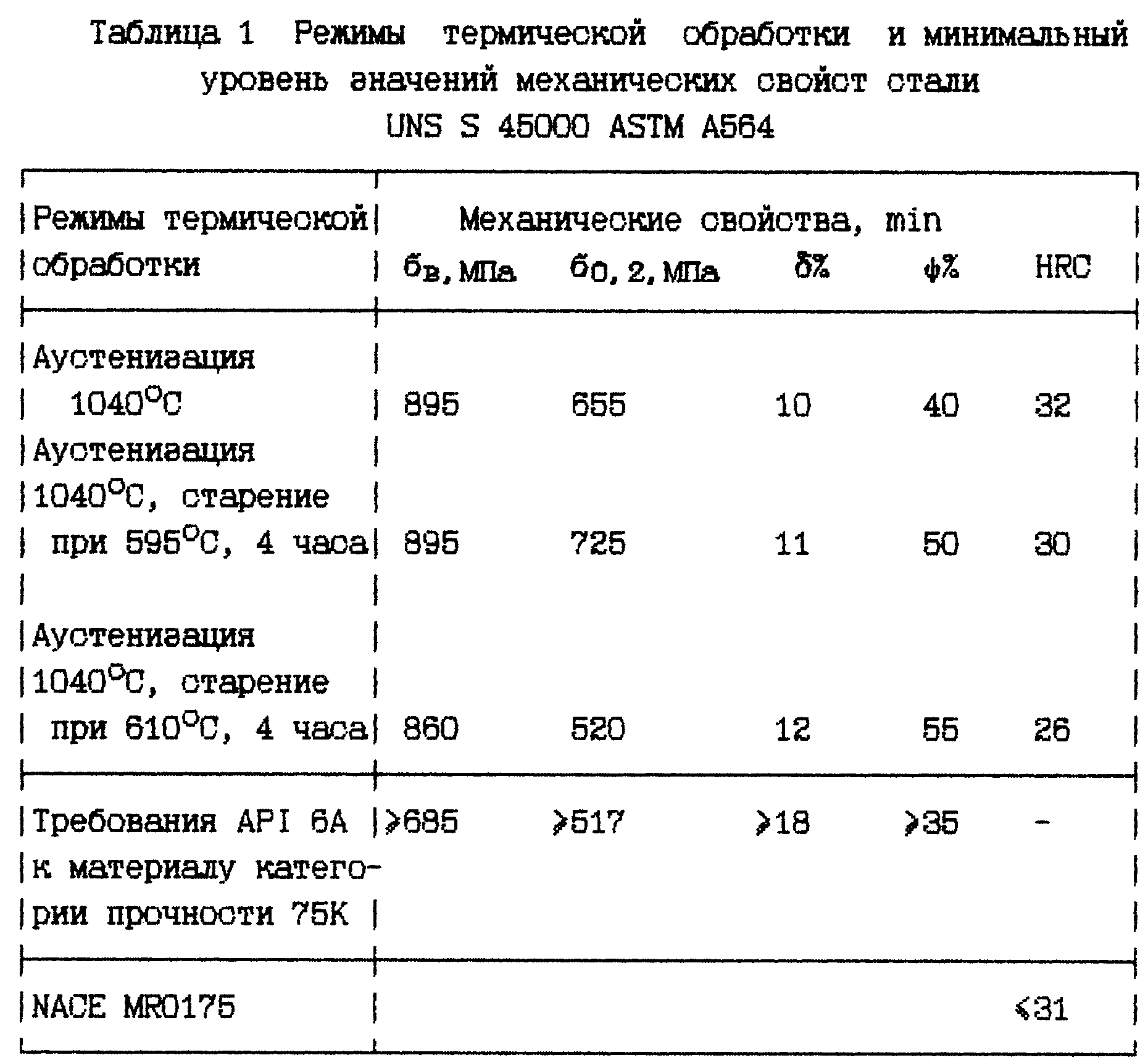 Предлагаемое изобретение относится к металлургии, в частности к термической обработке мартенситных дисперсионно-твердеющих сталей. Известны способы термической обработки стали, включающие закалку с температур 950-1000°С с охлаждением в воде и старение в интервале температур 230-650°С 2-3 часа, с применением обработки холодом после закалки или без обработки, которые обеспечивают уровень механических свойств стали, необходимый для использования стали в качестве высокопрочной, жаропрочной стали (ОСТ 92-1311-77 “Детали из сталей и сплавов. Технические требования и термообработка”, ТУ14-1-744-73 “Прутки горячекатаные и кованные из стали 08Х15Н5Д2Т-ВД (ЭП410У-вд).” Недостатками известных способов термической обработки стали являются низкий уровень гарантированных пластических характеристик (минимально гарантированный уровень относительного удлинения 10%), невозможность использования сталей для изготовления деталей, работающих в сероводородсодержащих средах под нагрузкой не менее 0,8 ( Известны способы термической обработки нержавеющих сталей переходного класса с дисперсионным упрочнением, включающие закалку с температур в интервале 925-1065°С и старение в интервале температур частичной аустенизации 730-760°С и в интервале дисперсионного твердения 400-565°С, применяемые для деталей повышенной прочности и твердости (А.А.Бабаков, М.В.Приданцев. Коррозионно-стойкие стали и сплавы. М.: Металлургия, 1971). Недостатками известных способов термической обработки стали являются низкий уровень гарантированных пластических характеристик (минимально гарантированный уровень относительного удлинения 10%), невозможность использования сталей для изготовления деталей, работающих в сероводородсодержащих средах под нагрузкой не менее 0,8 ( Известным техническим решением является способ термической обработки стали мартенситного класса с дисперсионным упрочнением марки UNS S 45000 ASTM A564 (ASTM A564 Standard Specification for Hot-Rolled and COld-Finished Age-Hardening Stainless Steel Bars and Shapes”), рекомендованной для работы в кислых средах стандартом NACE MR0175 с твердостью не выше 31 HRC (NACE MR0175 Standard Material Requirements. Sulfide Stress Cracking Resistant Metallic Materials for Oilfield Equipment). Недостатком данного технического решения является то, что при использовании режимов термообработки, приведенных в стандарте ASTM A564 (таблица 1), гарантируется низкий уровень минимальных значений относительного удлинения и минимальное значение твердости HRC близко к максимально допустимому для данной стали стандартом NACE MR0175. Термообработка по указанным режимам отечественных сталей мартенситного класса с дисперсионным упрочнением также не обеспечивает требуемый API 6A и NACE MR0175 комплекс механических свойств и образцы, изготовленные в соответствии с требованиями стандарта NACE TM0177 для испытания по методу А, не выдерживают 720 часов под необходимой нагрузкой в сероводородсодержащей среде. Известен способ термической обработки нержавеющих сталей мартенситного класса, включающий нормализацию и двукратный отпуск с температурой второго отпуска 500-600°С, (a.SU 1539221 A1, C 21 D 6/00; 6/02, прототип). Недостатком данного технического решения является то, что детали, обработанные данным способом, не выдерживают 720 часов под необходимой нагрузкой в сероводородсодержащей среде. Технической задачей предполагаемого изобретения является создание новых свойств известных сталей: стойкости к 