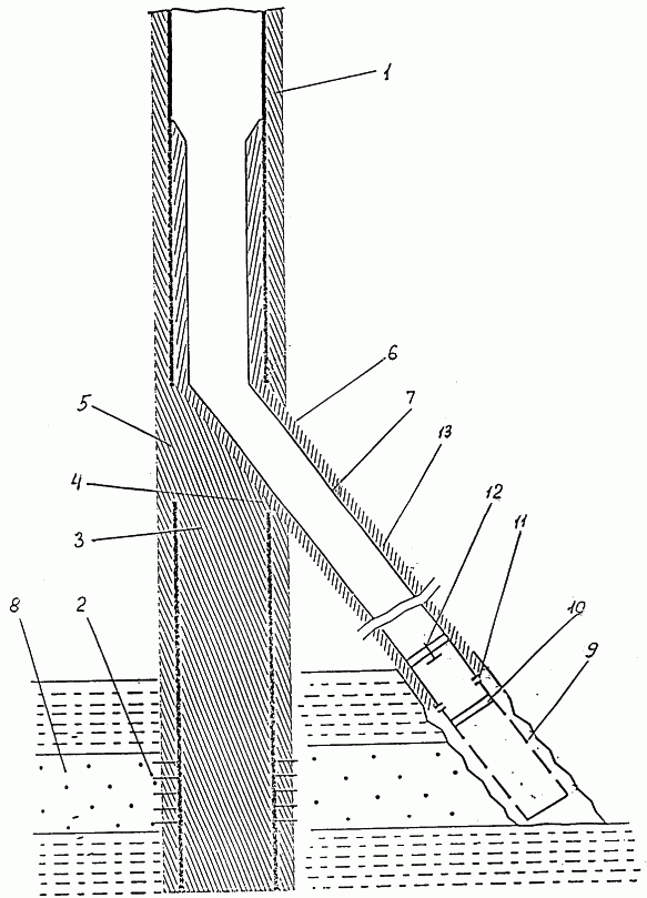 На бездействующей или аварийной скважине 1 имеются ранее перфорированные интервалы 2, цементный мост 3, новый искусственный забой 4, окно 5, наклонный ствол скважины 6, обсадная колонна 7, оборудованная в интервале продуктивного пласта 8 щелевым фильтром 9 и выше кровли продуктивного пласта 8 снабженная последовательно снизу вверх заглушкой из легкоразбуриваемого материала 10, циркуляционными отверстиями 11 и обратным клапаном 12. Заколонное пространство 13 выше кровли продуктивного пласта 8 зацементировано. В качестве материала для заглушки 10 может быть использован алюминий, медь и их сплавы, дерево и пр.