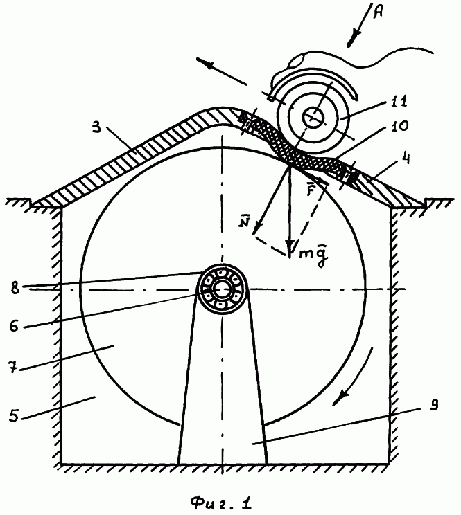 Работа устройства осуществляется следующим образом. Сразу же укажем, что при наезде автомобиля 11 на упругий участок 10 последний в исходном состоянии имеет возможность смещаться только по нормали к наклонным поверхностям 3, 4 под действием нормальной составляющей силы тяжести автомобиля и не имеет возможности смещения относительно барабана 7 в наклонных плоскостях 3, 4. Этот факт позволяет сразу же исключить разговор о возможном действии сил трения сцепления, возникающих между колесами и упругим участком 10 при торможениях – ускорениях автомобиля 11. Эти силы, даже в случае их возникновения, как и касательная составляющая силы тяжести , компенсируются реакциями дороги 1 на выступ 2 в местах его крепления к дороге 1, причем эти реакции действуют в наклонных плоскостях 3, 4. Более того, так как практически торможение-ускорение автомобиля происходят соответственно до и после проезда им выступа 2, то с большой достоверностью автомобиль в момент нахождения его на наклонных поверхностях 3, 4 выступа 2 можно рассматривать либо в состоянии покоя, либо равномерного движения. При наезде автомобиля 11, движущегося по прямой полосе I вверх по наклонной поверхности 4 выступа 2 /либо автомобиля 11, движущегося по встречной полосе II вниз по той же наклонной поверхности 4/ на упругий участок 10 под действием силы тяжести автомобиля 11 участок 10 вступает в контакт с боковой поверхностью барабана 7. При этом в месте контакта возникает частичная подвижность в пределах упругих деформаций выведенного из плоского состояния упругого участка 10 в нормальном и касательном направлениях, результирующая сила тяжести автомобиля раскладывается на радиальную нормальную составляющую и касательную составляющую , за счет последней возникает приложенный к барабану 7 однонаправленный вращающий момент /на фиг.1 – по часовой стрелке/, обуславливающий при наезде автотранспорта 11 на выступ 2 вращение барабана 7 вместе с выходной осью 6 в опорах вращения 8, сила компенсируется реакцией опоры 8, 9. Как было указано выше, вращение оси 6 с помощью кинематической связи передается на вал потребителя энергии. При движении автотранспорта 11 по наклонной поверхности 3, 4 выступа 2 по обеим полосам дороги действие силы тяжести компенсируется реакцией дороги 1 в месте установки на нее выступа 2.