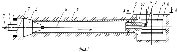 Во входном колодце (на фиг. не представлен) устанавливают ударный узел 1, на заднем конце которого закрепляется затягиваемая труба 2, расширитель 3 обычно надевается на ударный узел 1. От ударного узла 1 через старый трубопровод 5 протягивается трос 4 от лебедки на поверхность (на фиг. не показана). Расширитель 3 буртом упирается в торец старого трубопровода 5. Разрушитель 6 посредством троса 4, пропущенного через него и через блок 7, устанавливается в торец старого трубопровода 3 со стороны приемного колодца 8 и притягивается к забою. Для начала работы в ударный узел 1 подают сжатый воздух по воздухопроводу 9. В работу включают и лебедку (не показано), трос 4 натягивается, прижимая разрушитель 6 к торцу старого трубопровода 5. Ударный узел 1 через расширитель 3 передает стальной трубе ударную нагрузку, а натянутый трос 4 компенсирует отдачу ударного узла 1 и упругую реакцию грунтового массива и обеспечивает плотный контакт расширителя 3 с торцом стального трубопровода 5 в момент передачи ударного импульса. Под действием ударов ударного узла 1 старый стальной трубопровод 5 начинает выходить в приемный колодец 8, в котором ножи 10 разрушителя 6 разрезают его в продольном направлении на две части 11 (фиг.2). При достижении разрезанными частями 11 бортов приемного колодца 8 устройство останавливают и разрезанные в продольном направлении части 11 отрезают в поперечном направлении. Далее цикл повторяется. Выбивая трубопровод 5 из массива грунта, ударный узел 1 и расширитель 3 перемещаются вместе с трубопроводом 5, расширитель 3, уплотняя грунт, расширяет грунтовую скважину, затягивает в нее новый трубопровод.