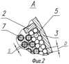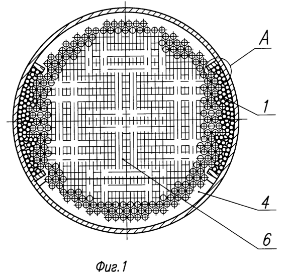Наиболее близким техническим решением, выбранным в качестве прототипа, является ограничитель перетечек теплоносителя между трубами и кожухом в теплообменном аппарате, выполненный в виде радиальных перегородок, установленных параллельно оси кожуха [2]. Однако при использовании указанных ограничителей в компактных кожухотрубных теплообменниках из-за наличия зазоров между радиальными перегородками и трубами, возникающих в производстве вследствие отклонений размеров и формы элементов теплообменника и соизмеримых по величине с зазорами между трубами, не удается избежать перетечек среды между трубами и кожухом, при этом часть теплоносителя проходит в пространстве между трубами и кожухом, не участвуя в процессе теплообмена, что ухудшает эффективность теплообменного аппарата.