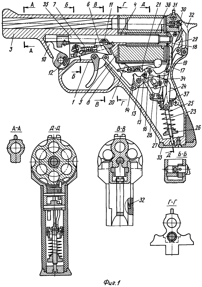 Соответственно компоновке револьвера устроены ударно-спусковой механизм двойного действия и механизм поворота и фиксации барабана. Между спусковым крючком и шепталом 34 фиг.1 установлен рычаг взвода 13 фиг.1, соединенный с первой тягой 8 фиг.1. На рычаге взвода установлен ролик 15 фиг.1, который приводит в движение кулачок 16 фиг.1 собачки поворота барабана 17 фиг.1. Собачка поджимается к храповику барабана пружинкой 18 фиг.1, установленной неподвижно в казеннике корпуса. Тяга 8 фиг.1 своим выступом приводит в действие фиксатор барабана 19 фиг.1. Пружинка 20 фиг.1 поджимает фиксатор к барабану, а выступ 21 фиг.1 предназначен для блокировки фиксатора при прохождении под ним выступа 14 фиг.1 рычага взвода, то есть при спуске курка, и наоборот блокирует спуск, если фиксатор не вошел в паз барабана или барабан не дошел до фиксированной позиции. Курок 22 фиг.1 приводится в действие тягой 23 фиг.1, которая связана с шепталом серьгой 24 фиг.1. Винтовая боевая пружина 25 фиг.1 упирается нижним витком в регулировочную гайку 26 фиг.1, а верхним витком в рычаг 27 фиг.1, который шарнирно соединен с толкателем 28 фиг.1 рычага взвода и предохранительной планкой 29 фиг.1. Таким образом, боевая пружина реактивным усилием возвращает в исходное положение рычаг взвода, спусковой крючок и предохранительную планку, разделяющую курок и боек 30 фиг.1. В верхней части казенника установлен регулируемый по горизонтали прицел 31 фиг.1. Щечки рукоятки фиксируют оси ударно спускового механизма и закреплены на рамке корпуса боковыми зацепами 32 фиг.1 и затыльником 33 фиг.1 с одним винтом.