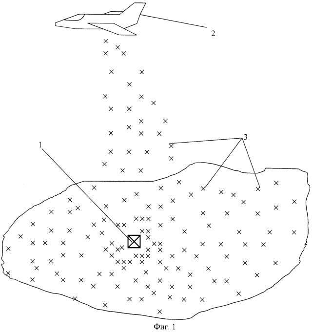На карте намечают цель 1 (фиг.1), затем с самолета 2 или иного технического средства разбрасывают метки 3 над целью 1, совмещают карту с фоном излучения меток, зафиксированного самолетом или спутником (фиг.2), выделяют оптимальную зону фонового излучения кустов 4 охвата цели 5 и по нему наводят заряд.