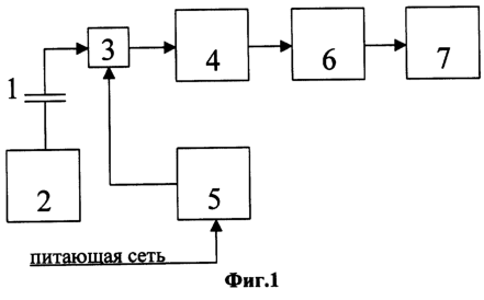 На практике наибольшее влияние на результат измерения вносит помеха, обусловленная питающей сетью (220 В, 50 Гц). Влияние данной помехи можно существенно уменьшить вышеприведенным методом. Для подавления ее с минимальными аппаратными затратами достаточно синхронизировать работу устройства управления 5 и, следовательно, моменты замыкания ключа 3 с частотой питающей сети (220 В, 50 Гц), а момент повторного замыкания ключа 3 сдвинуть относительно первого замыкания ключа 3 на величину, равную периоду частоты питающей сети (220 В, 50 Гц). В этом случаи величины погрешностей, обусловленных питающей сетью (220 В, 50 Гц), при первом и повторном замыкании ключа 3 будут практически одинаковы по значению и в выражении (7) можно принять к=1. Поэтому результат измерения, определенный по разности сигналов при первом и повторном замыканиях ключа 3 (см. фиг.2), практически не будет зависеть от этой помехи.