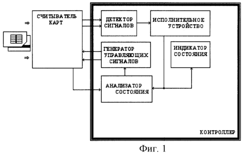 На фиг.1 представлена функциональная схема контроллера. Согласно изобретению контроллер обменивается сигналами со считывателем карт. Сам контроллер представлен из следующих функциональных блоков: