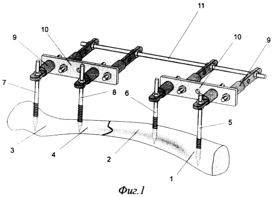 Способ осуществляется следующим образом. Под общим внутривенным обезболиванием после обработки операционного поля прокалывают кожу над верхней поверхностью метафизарного отдела проксимального фрагмента кости. Устанавливают винт-стержень 5 в анатомически безопасной зоне в метафизарный отдел проксимального фрагмента кости 1 во фронтальной плоскости в направлении сверху-вниз. Прокалывают кожу над верхней поверхностью диафизарного отдела проксимального фрагмента кости кнутри от ранее установленного фиксатора. Устанавливают винт-стержень 6 в анатомически безопасной зоне в диафизарный отдел проксимального фрагмента кости 2 параллельно винт-стержню 5 и перпендикулярно оси кости во фронтальной плоскости в направлении сверху-вниз. В дистальный фрагмент кости стержни устанавливают аналогично стержням 5 и 6. Прокалывают кожу над верхней поверхностью метафизарного отдела дистального фрагмента кости. Устанавливают винт-стержень 7 в анатомически безопасной зоне в метафизарный отдел дистального фрагмента кости 3 во фронтальной плоскости в направлении сверху-вниз перпендикулярно оси кости. Прокалывают кожу над верхней поверхностью диафизарного отдела дистального фрагмента кости кнутри от ранее установленного фиксатора. Устанавливают винт-стержень 8 в анатомически безопасной зоне в диафизарный отдел дистального фрагмента кости 4 параллельно стержню 7 и перпендикулярно оси кости во фронтальной плоскости в направлении сверху-вниз. Стержни крепят с помощью кронштейнов 9 к внешним опорам, выполненным из многодырчатых планок 10, соединенных кронштейнами 9 и резьбовым стержнем 11. Дозированным перемещением опор и винт-стержней производят репозицию костных фрагментов. Устранение смещения фрагментов по длине производится перемещением многодырчатых планок 10 вдоль резьбового стержня 11. Смещение фрагментов по ширине устраняется перемещением винт-стержней относительно кронштейнов 9 и многодырчатых планок 10. Срок иммобилизации 4-6 недель. Одновременно проводят функциональное лечение.