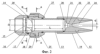 Сопло 12 закрепляется на втулке 13 с помощью накидной гайки 19. Стык между соплом 12 и втулкой 13 герметизируется уплотняющей прокладкой 20. Профилированный канал сопла состоит из следующих последовательно расположенных участков: сужающегося участка 21 коноидальной формы, сужающегося конического участка 22, цилиндрического участка 23 и расширяющегося конического участка 24.