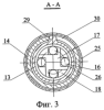 Азимутальное перемещение отверстий 16 и 26 может происходить в ограниченном угловом диапазоне от 0° до 45°. Ограничение углового перемещения обеспечивается с помощью выступа 29 на втулке 13, который фиксирует крайние угловые положения втулки 13 при движении вдоль стенок паза 30, выполненного в торцевой части штуцера 14 (см. фиг.3).