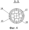 Распылитель жидкости, изображенный на фиг.2, состоит из сопла 12 с профилированным каналом, втулки 13 с цилиндрической камерой и штуцера 14. В штуцере 14 выполнена встроенная диафрагма 15 с четырьмя отверстиями 16. На входе в цилиндрическую камеру втулки 13 у входного торца камеры установлен завихритель 17 с направляющими элементами 18. Четыре направляющих элемента 18 установлены равномерно по азимуту поперечного сечения цилиндрической камеры. Количество направляющих элементов 18 может изменяться от трех до шести в различных вариантах выполнения конструкции распылителя жидкости.