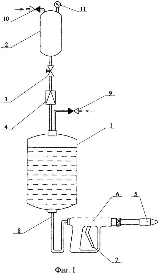 Емкость 1 и баллон 2 с магистралью подачи сжатого газа и арматурой устанавливаются на ранце оператора либо в переносном контейнере. Генерация газокапельного потока осуществляется оператором с помощью распылителя жидкости 5, установленного на стволе 6, посредством куркового механизма 7.
