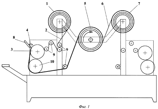 Слой полиэтилена 6 призван исключить возможность прилипания разогретого клея 4 к изнанке бумаги 2. Ролики 9 и вал 10 обеспечивают компенсацию неравномерной вытяжки и перекоса антиадгезионной бумаги 2.