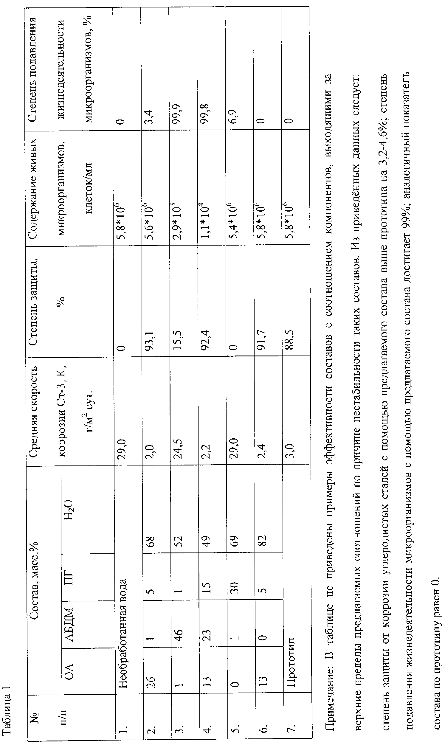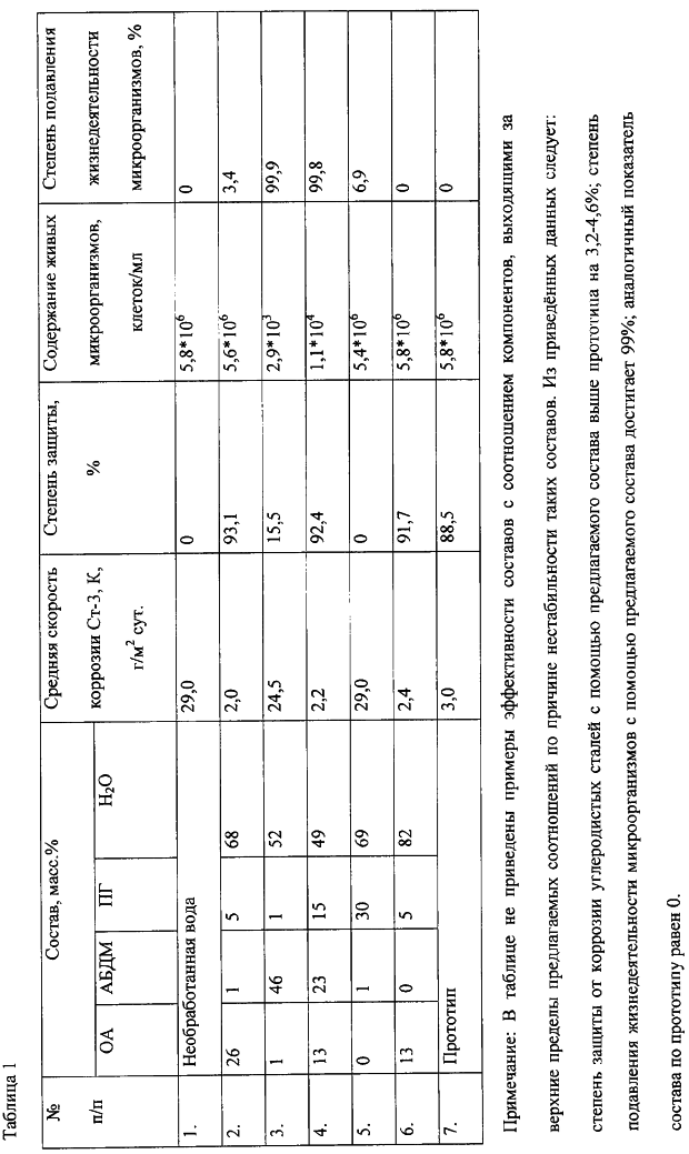 Изобретение относится к области защиты черных и цветных металлов от коррозии и отложений (солеотложений и биоотложений) в водооборотных системах и может быть использовано в различных областях промышленного производства, в том числе и в пищевой промышленности. Состав содержит, мас.%: окись алкилдиметиламина 1-26; алкилдиметилбензиламмонийхлорид 1 – 46; пропиленгликоль 1-30; вода – остальное. Технический результат: повышение защитного эффекта как от коррозии металла и отложения солей, так и от биоотложений на поверхности оборудования, выполненного из черных и цветных металлов. 1 табл.
