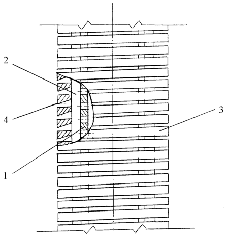 Скважинный фильтр включает перфорированный каркас 1, опорные стержни 2, витки профилированной проволоки 3 (или наборные кольца из пластмассы или пропилена, на чертеже не показано) с образованием расширяющихся щелей во внутреннюю сторону фильтра. Витки профилированной проволоки выполнены с прямоугольными гранями в сечении, нижние из которых скошены с внутренней стороны под углом 4 к горизонту, соответствующим углу естественного откоса пластовой породы или гравийной набивки в среде фильтрующего агента.