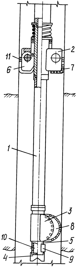 В процессе бурения в результате трения о стенки скважины канат 10 подвергнется обрыву и по достижению центратором 2 расширенной части ствола скважины произойдет переключение шарнирных подпружиненных лопастей 6 в рабочее положение и дальнейшее бурение с расширением ствола скважины будет продолжаться с одновременной центрацией устройства относительно расширенного ствола скважины и калибровкой диаметра расширенного ствола скважины. После окончания процесса расширения и окончательной промывки скважины устройство извлекают из скважины, при этом при достижении шарнирных подпружиненных лопастей узкой части ствола скважины они переводятся в транспортное положение.