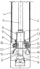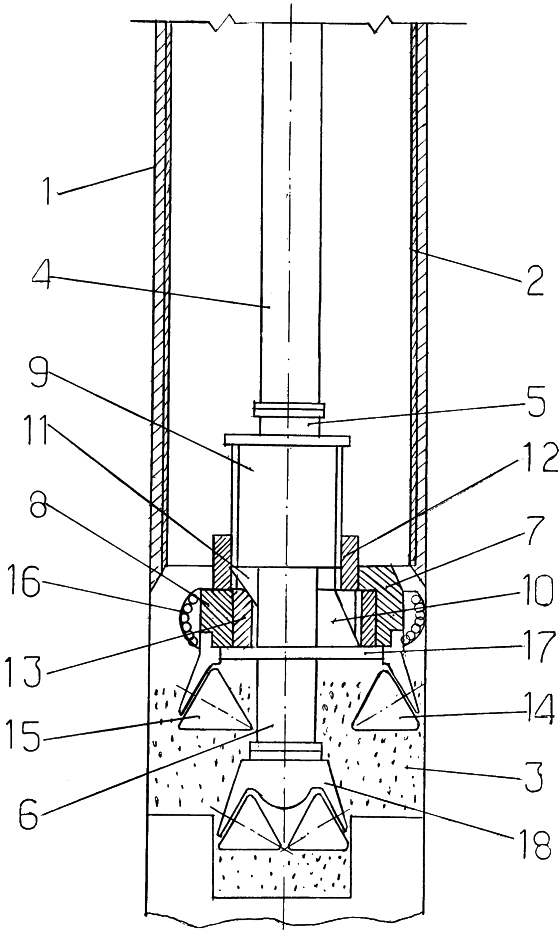 Работа устройства заключается в следующем. В пробуренную скважину 1 глубиной более чем длина обсадной колонны на 2,5-3 м засыпают песок для образования подбашмачной камеры и спускают обсадную колонну 2 и цементируют ее.