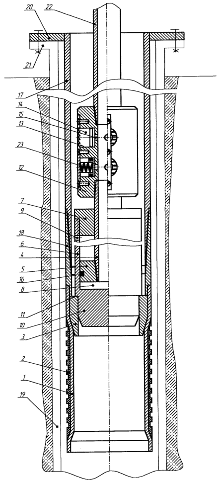 Избыточное давление одновременно распространяется и на гидрокамеру 8, под воздействием которого на ее цилиндр 6 и, соответственно, на расширитель 3, создается дополнительная нагрузка (которой можно широко варьировать), происходит дальнейшее перемещение расширителя 3 вниз и прижатие корпуса 1 и манжеты 2 к стенкам обсадной колонны 19. После этого давление сбрасывают, под воздействием пружин 23 плашки 14 возвращаются в исходное положение. Посадочный инструмент и якорный узел поднимают на поверхность.