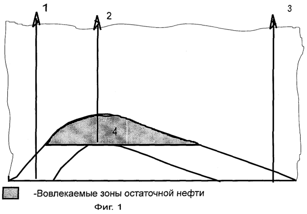 Техническая задача предлагаемого способа заключается в повышении нефтеизвлечения за счет эффективного вовлечения в разработку участков месторождения с трудно извлекаемыми запасами нефти застойных зон, расположенных в вершинах куполообразных поднятий, контролирующих месторождение.