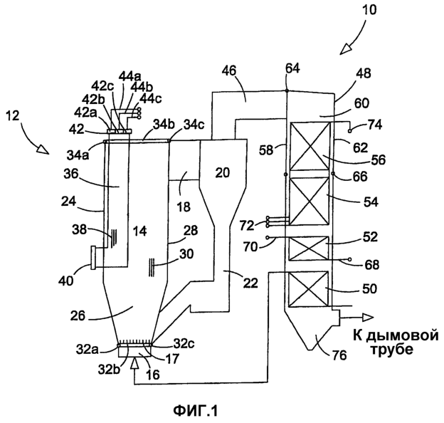 Печь 14 закрыта, по меньшей мере частично, одной или более трубчатыми поверхностями предварительного нагрева. В предпочтительном варианте осуществления, показанном на фиг.1, печь 14 закрыта передней стенкой 24, двумя боковыми стенками 26 (из которых на фиг.1 видна только одна) и задней стенкой 28, которые образованы из обычных трубных панелей. Когда питательная вода протекает через трубные панели, которые формируют корпус печи, теплота изнутри печи предварительно нагревает питательную воду. Трубные панели предпочтительно образованы из вертикальных труб 30, сваренных вместе ребрами и расположенных параллельно между впускными коллекторами 32a, 32b и 32c трубных панелей передней стенки 24, боковых стенок 26 и задней стенки 28, соответственно, и соответствующими выпускными коллекторами 34a, 34b и 34c.
