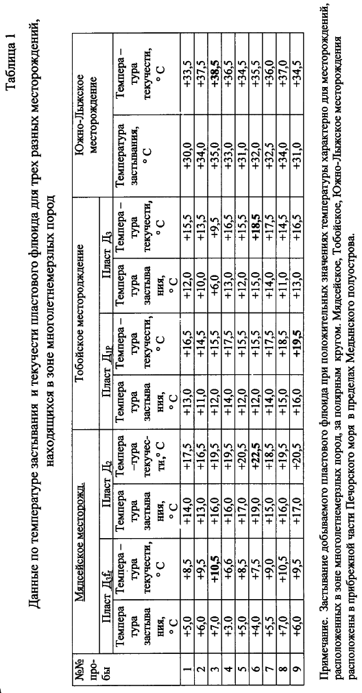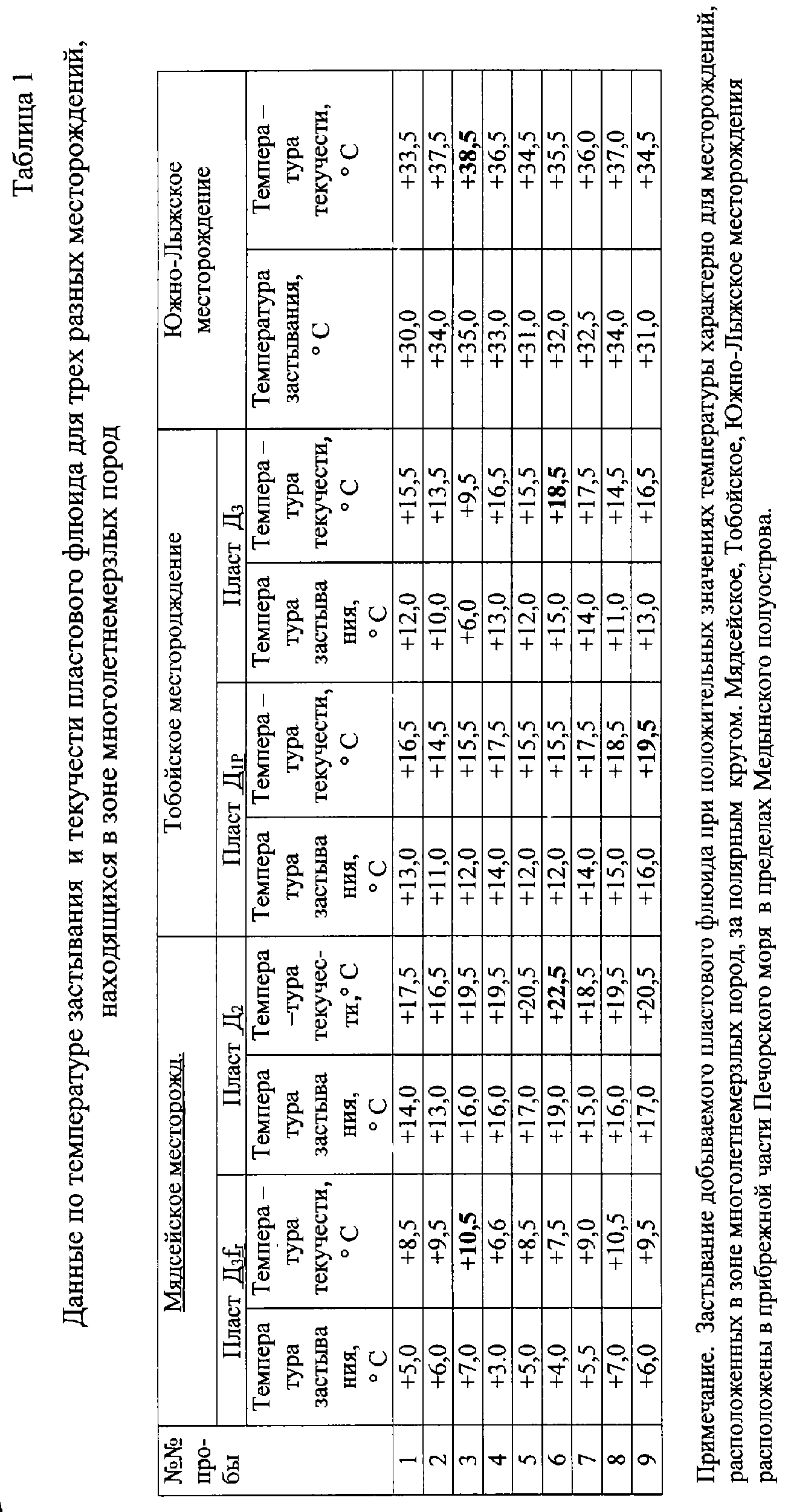 В отобранных пробах пластового флюида по ГОСТ 20287-91 определяли температуру текучести и температуру застывания пластового флюида в каждой пробе. Данные по температуре застывания и текучести пластового флюида для трех разных месторождений приведены в таблице 1.