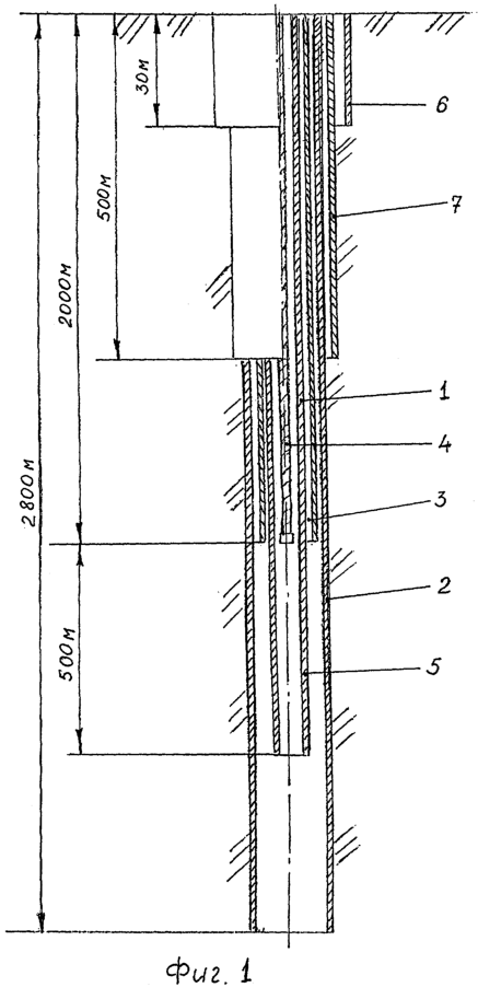 В скважину глубиной 3000 м, предварительно заглушенную, например, модифицированной жидкостью глушения с добавлением химреагента ГФ-1, обсаженную эксплуатационной колонной 2 диаметром 168 мм, спустили колонну НКТ 1 диаметром 2,5” на глубину ниже интервала перфорации на 15-20 м. Низ колонны НКТ 1 снабдили крестовиной.