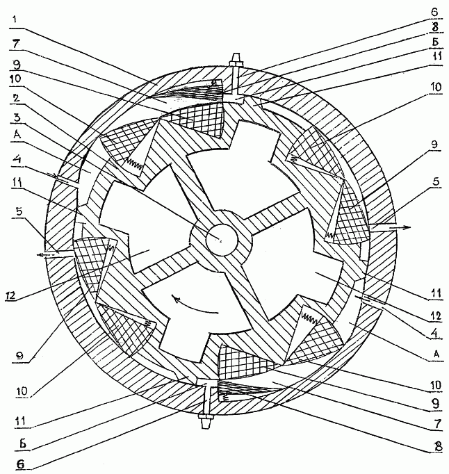 Роторный двигатель внутреннего сгорания содержит неподвижный статор 1 и ротор 2, вращающийся на валу 3. В статоре выполнены по два впускных отверстия 4 для впуска топливной смеси, два выпускных отверстия 5 для выпуска отработавших газов, а также два отверстия 6 для подвода средств зажигания. При этом все пары отверстий расположены в статоре диаметрально противоположно друг другу. Внутренняя поверхность статора выполнена в виде концентрической с цилиндрическим ротором окружности, имеющей две эллипсоидные впадины 7, плавно сопряженные с концентрическими частями окружности и расположенные с диаметрально противоположных сторон статора. С одной стороны каждой впадины 7 у концентрической части размещено отверстие 4 для впуска топливной смеси. С другой стороны каждой впадины 7 в месте ее перехода в концентрическую часть выполнен в виде клина перепускной обратнозапорный клапан 8, закрепленный на теле статора со стороны впадины 7 и подвижный под действием пружины со стороны стыка с концентрической частью статора. При этом оба клапана 8, плавно сопряженные с поверхностью статора своей вогнутой поверхностью, расположены с диаметрально противоположных сторон статора. Ротор 2 содержит четыре пары равномерно разнесенных по окружности уплотнительных элементов – клапанов 9 и 10. Каждая пара клапанов 9 и 10 выполнена в виде клиньев с выпуклыми поверхностями, сопрягаемыми с поверхностью ротора, соединенных друг с другом на поверхности ротора в одной точке концами одинаковых углов, закрепленных на поверхности ротора, например, шарнирно, и радиально подвижных и выступающих из тела ротора с противоположных закрепленной точке сторон каждой пары. В неработающем положении пары уплотнительных клапанов-клиньев 9 и 10 утоплены в тело ротора и образуют с ним сплошную цилиндрическую поверхность. В рабочем положении все пары клапанов-клиньев 9 и 10 радиально подвижны под действием пружин и центробежных сил с противоположных сторон каждой пары и постоянно взаимодействуют с профилированной направляющей статора. Кроме того, между четырьмя парами клапанов-клиньев 9 и 10 на цилиндрической поверхности ротора выполнены равномерно разнесенные по окружности четыре выступа 11, выступающие на ширину зазора между ротором и статором в концентрической части, служащие для открывания перепускных обратнозапорных клапанов 8 статора. При этом у впускного отверстия 4 в каждой впадине 7 образуется камера А впуска топливной смеси. При попадании ее (при продвижении по часовой стрелке) между обратнозапорным клапаном 8 (открываемом выступом 11 и пропускающим топливную смесь) и выступом 11 против отверстия 6 со средствами зажигания образуется камера Б сжатия и сгорания топливной смеси. И зазор между статором и ротором до выходного отверстия 5 служит для удаления отработавших газов. Кроме того, в теле ротора выполнены симметрично расположенные пустоты 12 одинаковой конфигурации. Статор жестко закреплен на станине (не показана). Ротор, вставленный в статор, с торцов закрыт крышками (не показаны), имеющими отверстия, аналогичные по форме пустотам 12 в теле ротора. Роторный ДВС работает следующим образом.
