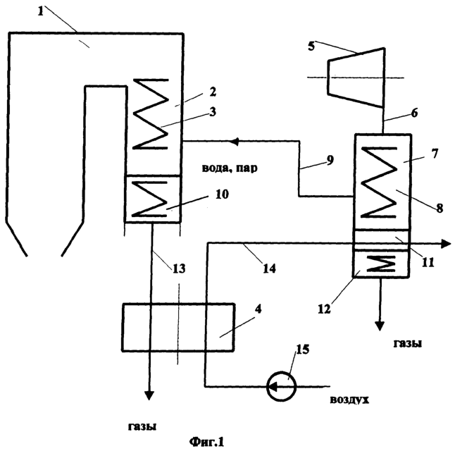ПГУ по способу согласно изобретению работает следующим образом. Котел 1, работающий на любом топливе, и газовая турбина 5 эксплуатируются в своих обычных режимах. Выхлопные газы турбины 5 глубоко охлаждаются в отдельном конвективном газоходе 7 дополнительными поверхностями 8, 10, 11, 12 нагрева котельного воздуха, питательной воды и конденсата, что обеспечивает максимальную утилизацию тепла. С другой стороны, тепло, переданное в газоходе 7 дополнительным котельным поверхностям 8, при сохранении полной паропроизводительности котла (с поверхностями нагрева 3 и 8) позволяет сжигать в нем меньше топлива.