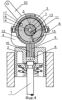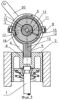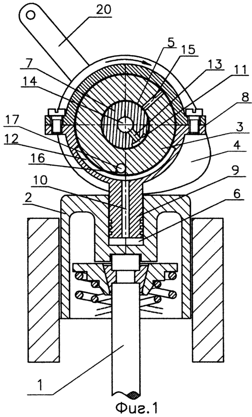 Изобретение поясняется графическим материалом, где на фиг.1 показана схема поперечного сечения устройства с примером конкретного выполнения толкателя в виде поршня; на фиг.2 – вид с боку, совмещенный с разрезом; на фиг.3, 4 и 5 представлена последовательность работы устройства; на фиг.6 изображено поперечное сечение распределительного вала и хомута; на фиг.7 показана схема устройства с толкателем в виде штанги с коромыслом, а на фиг.8 и 9 – в виде двуплечего рычага.