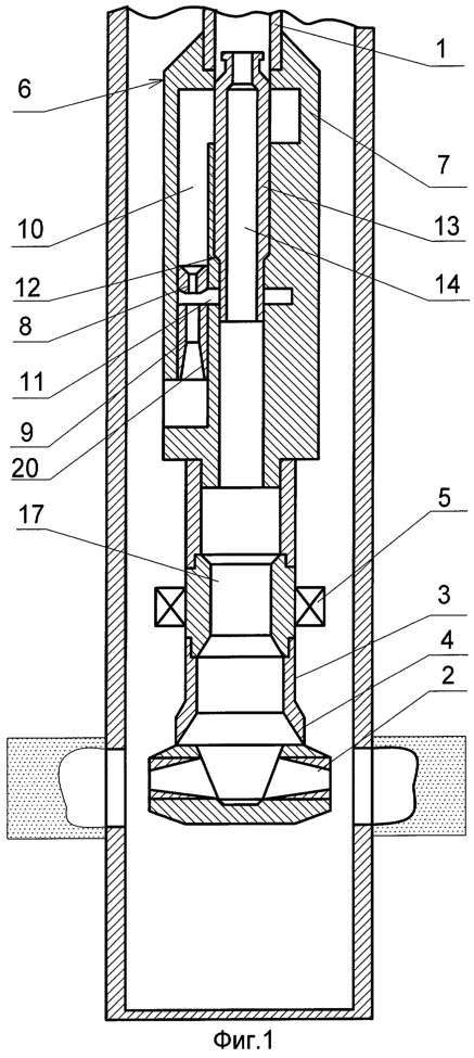 Анализ проводимых в скважине работ по их исследованию и обработке прискважинной зоны продуктивного пласта показал, что все эти работы можно проводить без промежуточных извлечений колонны труб на поверхность при переходе от одной технологической операции к другой, что позволяет значительно превысить эффективность проводимых работ и сократить сроки их проведения. Этого удалось добиться в первую очередь благодаря тому, что и корпус струйного насоса и пакер выполнены с центральным проходным каналом, а устройство для гидроструйной обработки прискважинной зоны пласта, в данном случае это гидроперфоратор, выполнен с возможностью его сброса на забой, что позволяет производить через колонну труб спуск и установку в зоне продуктивного пласта различного рода оборудования, например, комплексного геофизического прибора.