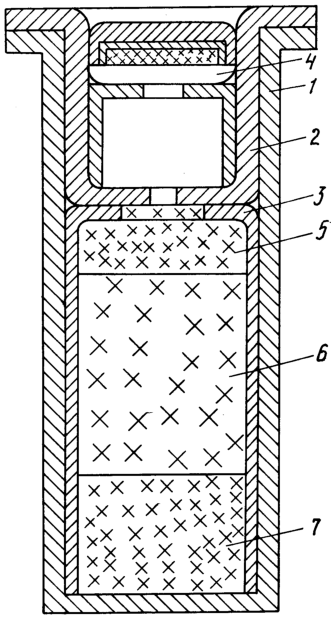 При срабатывании запала 4 воспламеняется герметизирующий малогазовый состав 5, а от него задействуется замедлительный состав 6 (в изделиях с замедлением) или боевой заряд 7 (в изделиях мгновенного действия). При этом, сгорая, герметизирующий малогазовый состав образует твердую газонепроницаемую шлаковую пробку, которая герметизирует изделие.