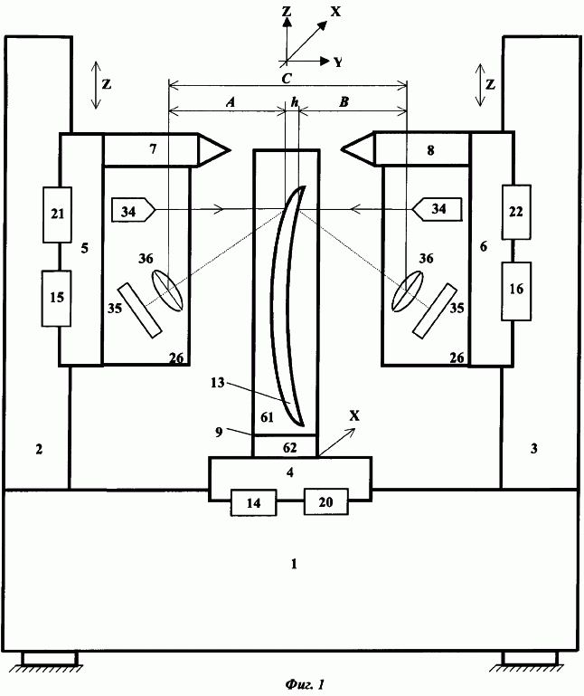 Каждая из оптоэлектронных головок 26 состоит из источника 34 светового луча, например лазера, фотоприемника 35 и объектива 36 (фиг.1). При этом контролируемая лопатка 13 установлена в промежутке между оптоэлектронными головками 26 так, что их объективы 36 обеспечивают триангуляционную оптическую связь фотоприемников 35 с источниками 34 узкого светового луча через соответствующую поверхность пера лопатки 13.