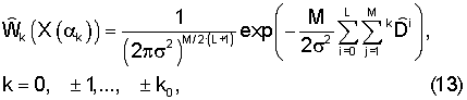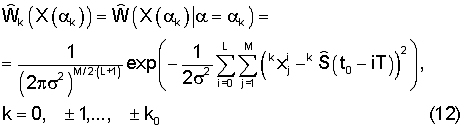 получаемую как результат усреднения наблюдений по столбцам матрицы (10). Поскольку контрольные направления, в общем случае, не совпадают с истинным направлением обратного канала, то и оценки максимального правдоподобия сигналов (11) нельзя считать корректными. Для таких оценок предложено название обобщенных оценок максимального правдоподобия (ООМП) (см. работу Трифонов А.П., Шинаков Ю.С. Совместное различение сигналов и оценка их параметров на фоне помех. – М.: Радио и связь, 1986). Тем не менее, указанными ООМП принимаемых сигналов можно воспользоваться для расчета условных плотностей вероятностей и формирования ОМП направления прихода отраженного сигнала. Согласно принятой модели (1), условная плотность вероятности наблюдения выборки х( k) для каждого контролируемого направления будет