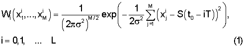В результате при наличии отраженного сигнала условная плотность вероятности наблюдения выборки , присутствующей на срезе отводов с одинаковыми индексами задержек i (одинаковые задержки в каналах 1 на i Т), будет следующей: