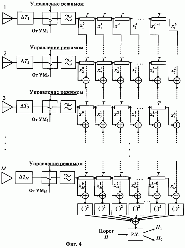Обычно сверхширокополосная локационная система реализуется с помощью многоэлементной антенной решетки, блок-схема которой изображена на фиг.1. Эта многоэлементная антенная решетка, в данном случае, выбрана линейной (одномерной) для простоты пояснений. Она содержит каналы 1 наблюдения с первого (1.1) по М-й (1.М). Каждый канал 1 наблюдения содержит соединенные последовательно антенный элемент 2, блок 3 управляемой задержки, переключатель 4 режима работы (переключатель прием-передача), фильтр 5 нижних частот и линию 6 задержки, которая состоит из L одинаковых элементов 7 задержки, каждый с временем Т задержки, и имеет L+1 отводов. Блоки 3 управляемой задержки используются для установки главного направления зондирования как при передаче, так и при приеме. Фильтры 5 нижних частот предназначены для селекции отраженных сигналов в частотном диапазоне. Линии 6 задержки используются, чтобы выполнить оптимальную обработку наблюдений для обнаружения и оценки направления прихода отраженного импульса.