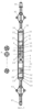 Указанная выше задача может быть достигнута и тем, что предлагаемое устройство снабжено мост-камерой, состоящей из двух взаимоперпендикулярных герметичных полостей, в одну из которых установлен источник гамма-излучения, а в другую симметрично относительно источника закреплены два свинцовых коллимированных экрана, причем к мост-камере с двух сторон от источника гамма-излучения присоединены два измерительных блока, состоящие из кожухов, закрепленных на опорах, причем внутри кожухов установлены свинцовые коллимированные экраны, электронные блоки и наконечники, а на опорах одного измерительного блока установлены по четыре детектора, равномерно распределенных по периметру коллимированного свинцового экрана, малого и большого зондов гамма-гамма-каротажа, причем детектры малого зонда смещены в поперечном сечении относительно детекторов большого зонда на угол, равный 25,5 угловым градусам, электронная схема с телесистемой и датчик углового положения, жестко ориентированный в плоскости, проходящей через ось прибора и ось одного из детекторов, принятого за отсчетный, а на опорах другого измерительного зонда закреплены четыре равномерно распределенных по периметру коллимированного свинцового экрана детектора большого зонда и электронная схема, причем детекторы больших зондов обоих измерительных блоков смещены в поперечном сечении относительно друг друга на угол, равный 45 угловым градусам, а оба измерительных блока помещены в герметичные корпуса, закрепленные на мост-камере.